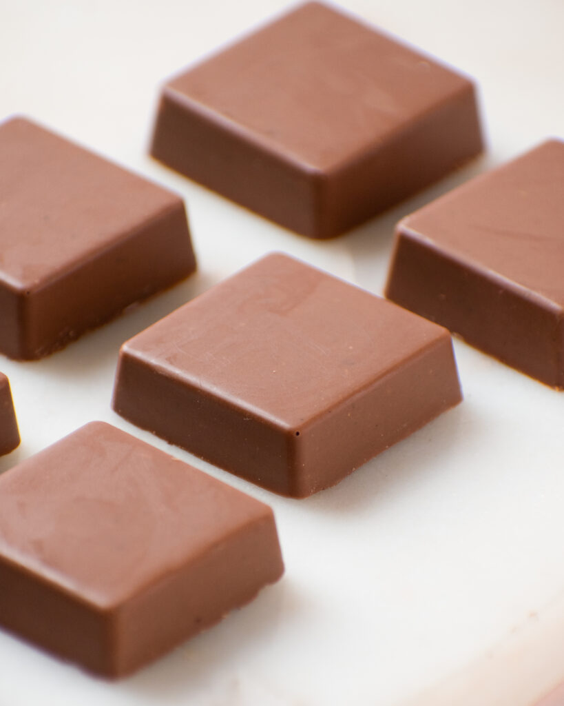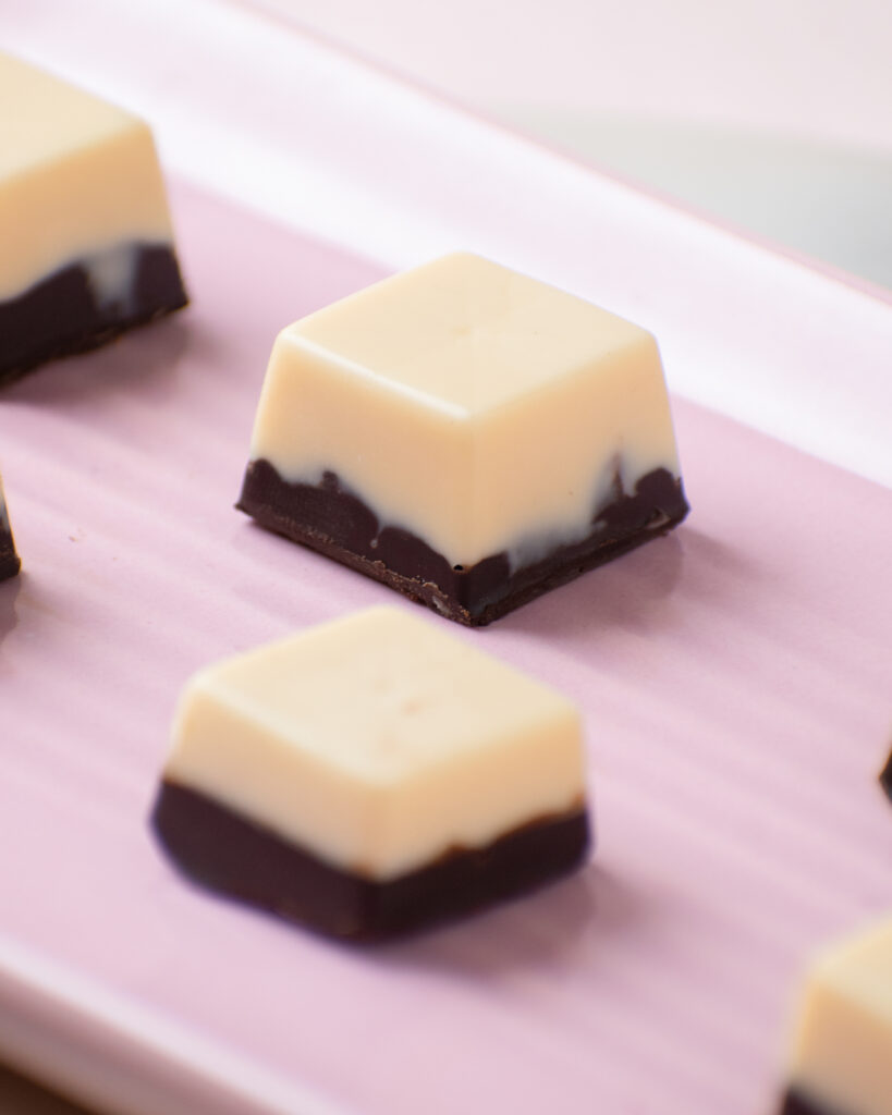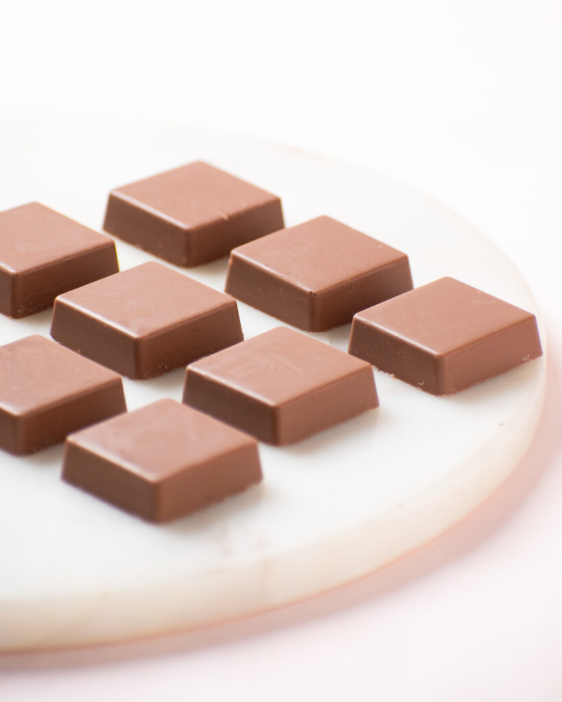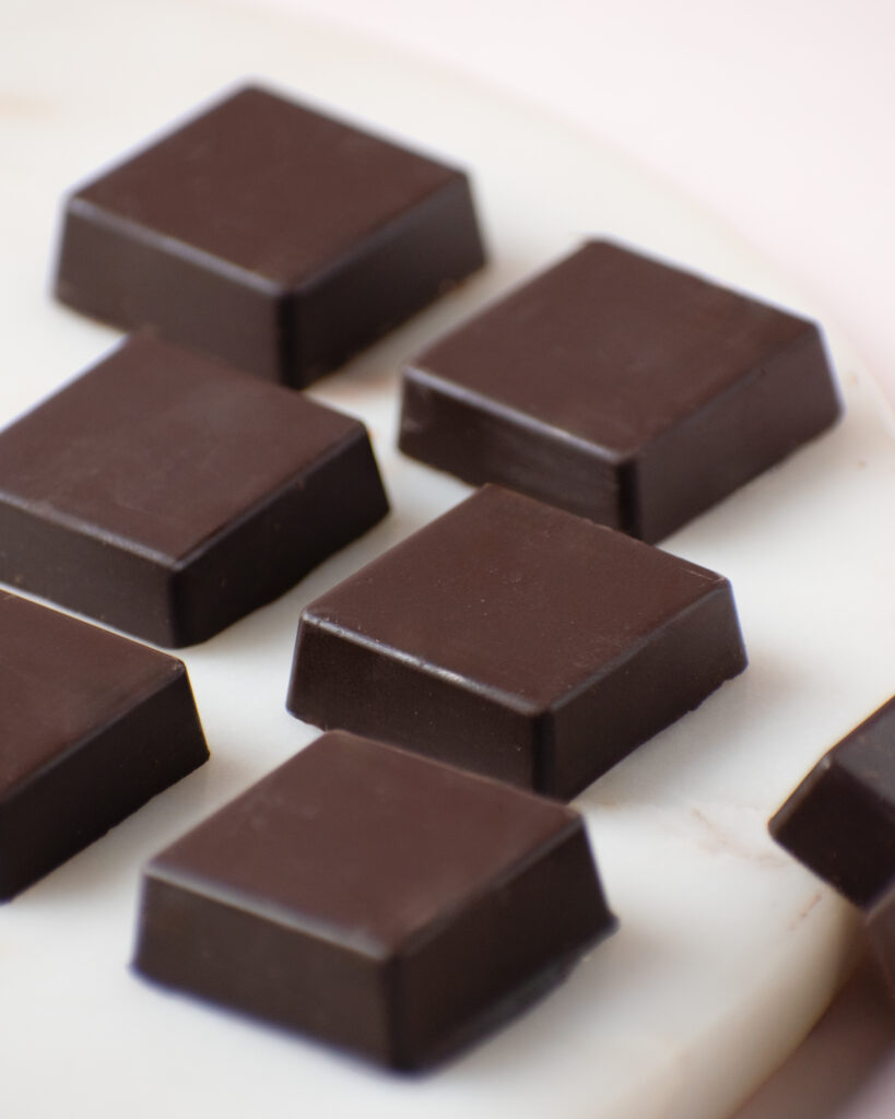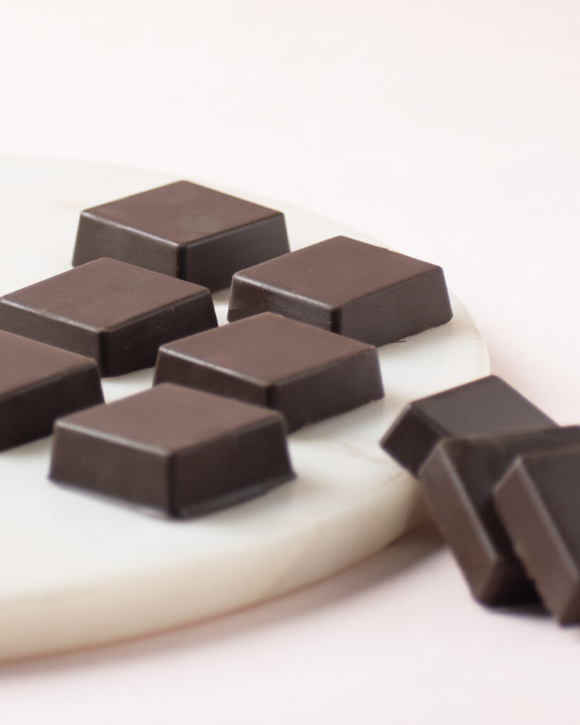 Each piece is poured and decorated by hand, combining the beauty of fine chocolate with the joy of natural toppings.