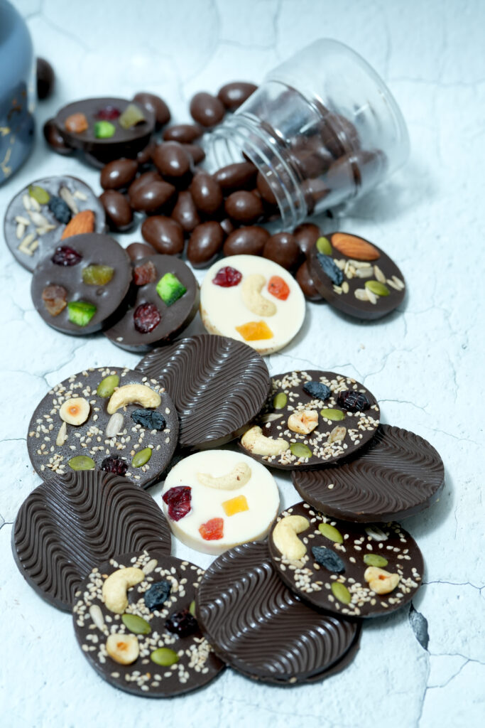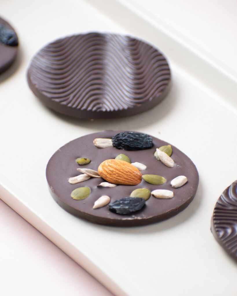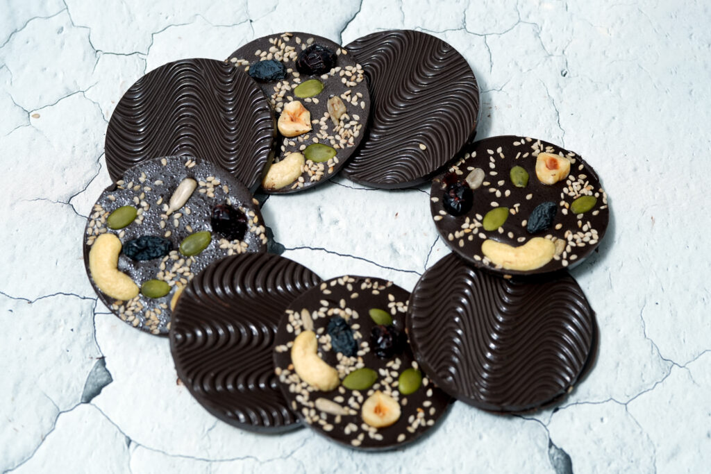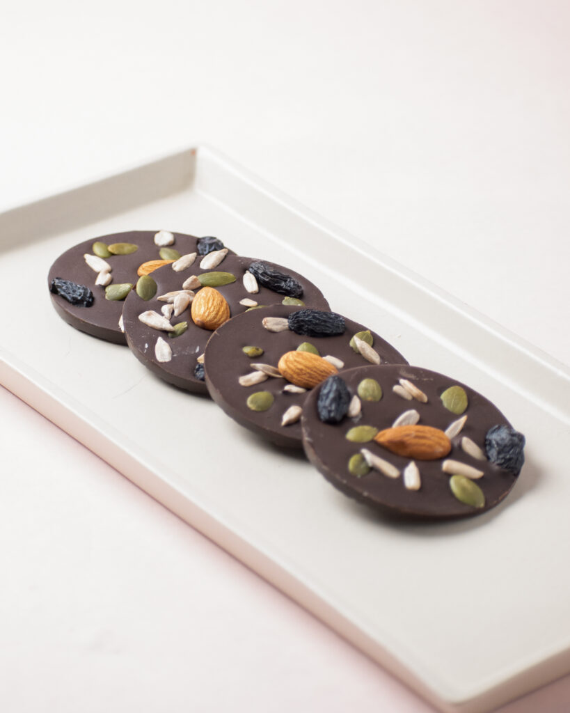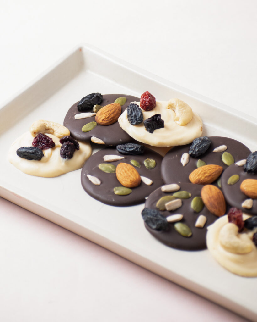 Discover the artistry of our Mendiants — handcrafted chocolate discs topped with an elegant mix of nuts, berries, and fruits.