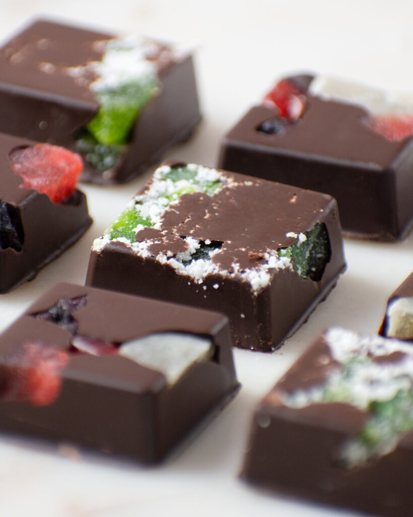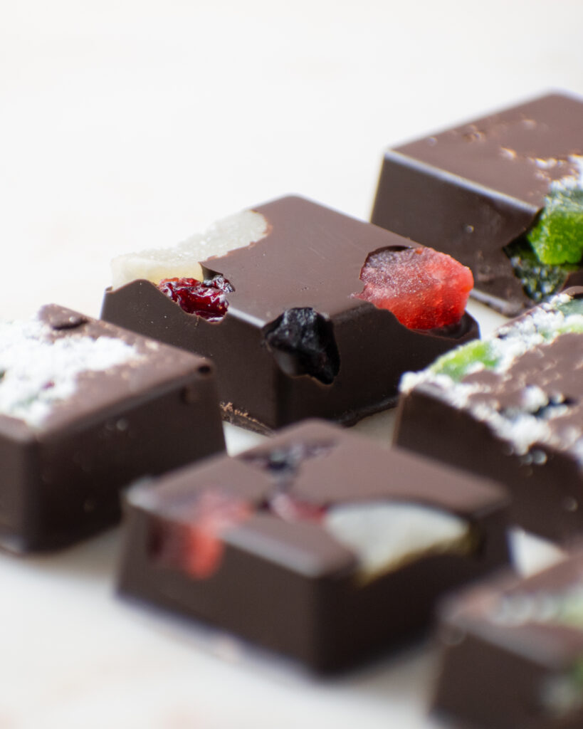 Dark Chocolate Mendiants: Bold and rich with roasted almonds and cranberries.