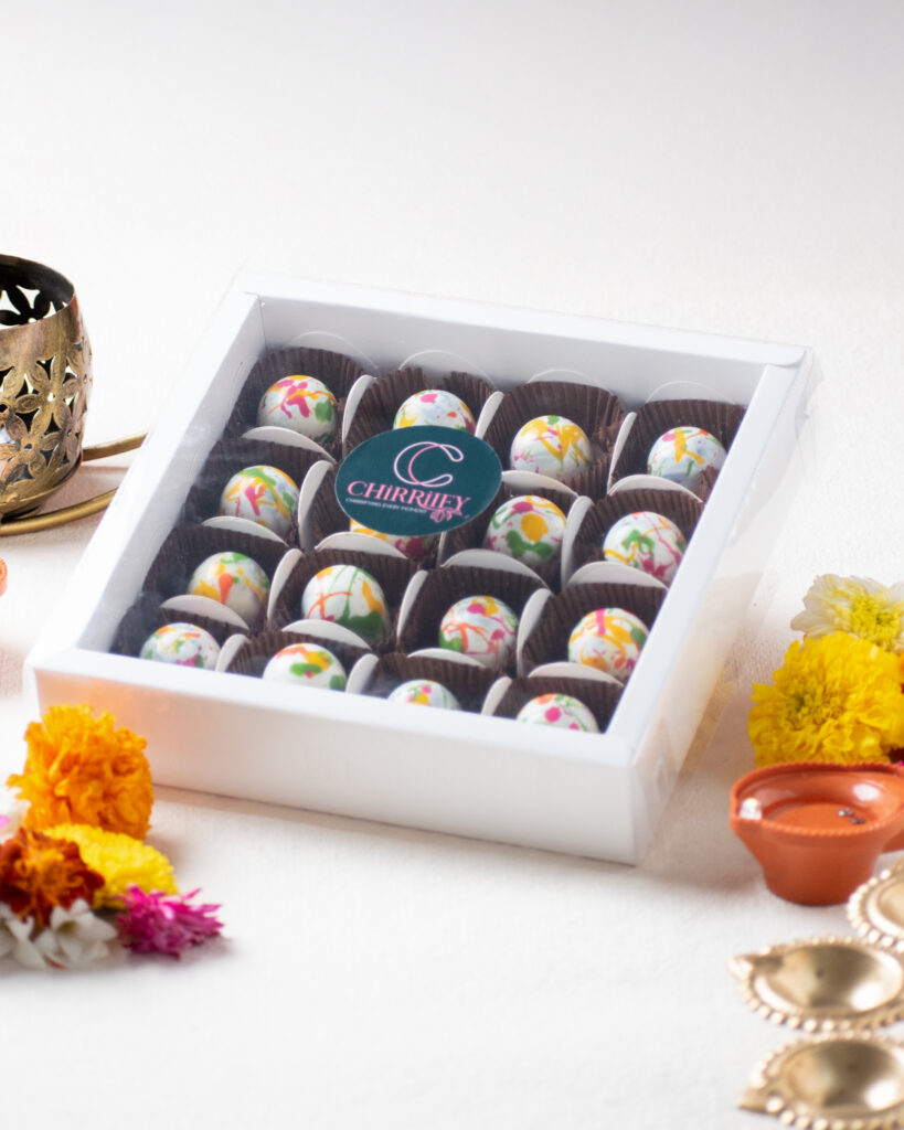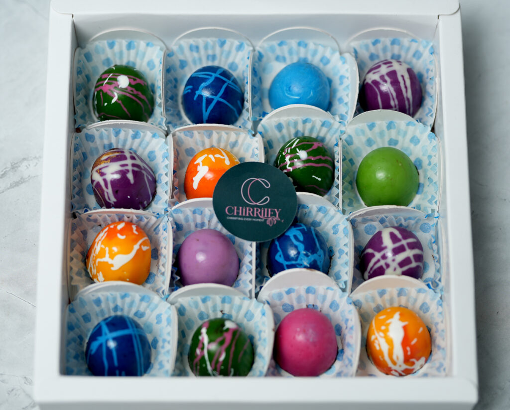 Chirriifying Every Moment – where chocolate is not just made it’s crafted, with love. Every piece that leaves our kitchen is handmade in small batches, blending fine ingredients, creativity, and care to create a truly indulgent experience. From creamy fudges to elegant mendiants, colorful bonbons to festive hampers our chocolates are crafted to delight every heart and sweeten every occasion.