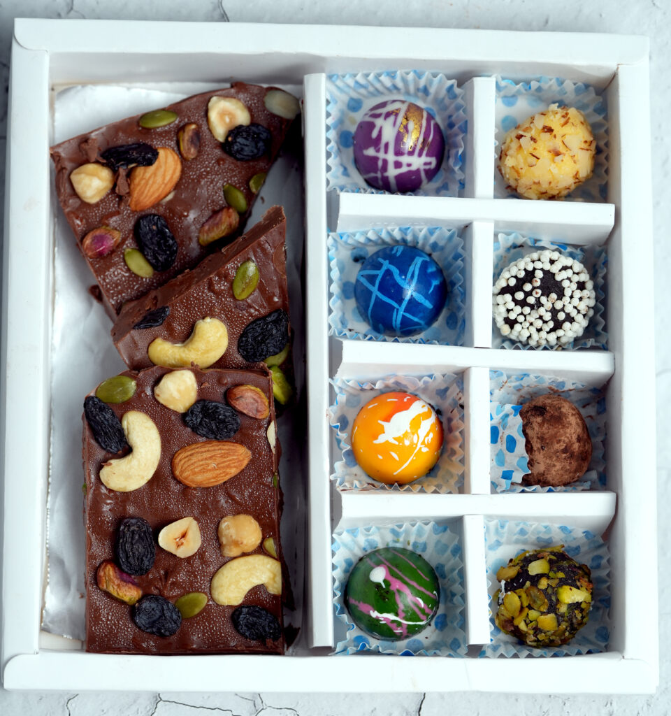 Each hamper is a blend of indulgence and elegance, featuring a selection of our finest chocolates, fudges, and mendiants and many more — beautifully packed and ready to gift.